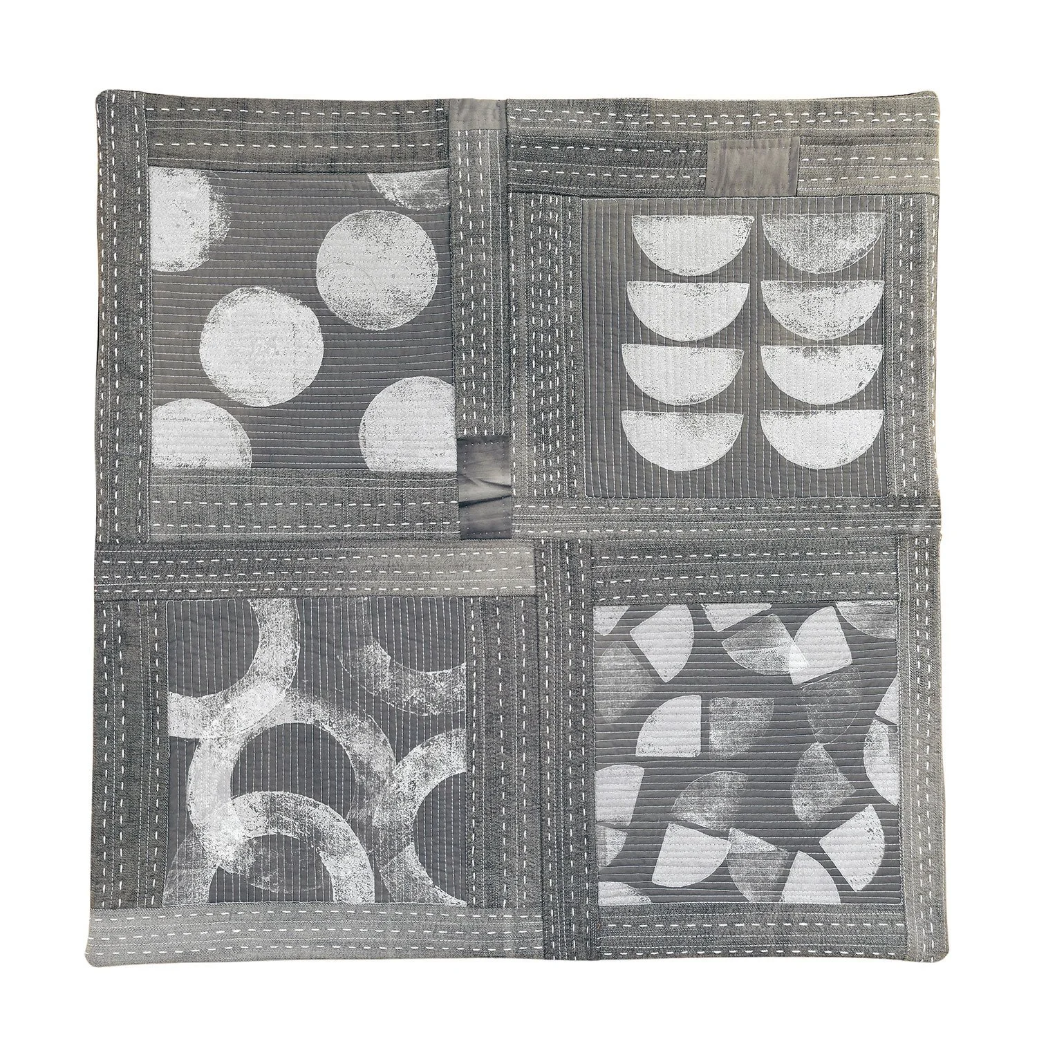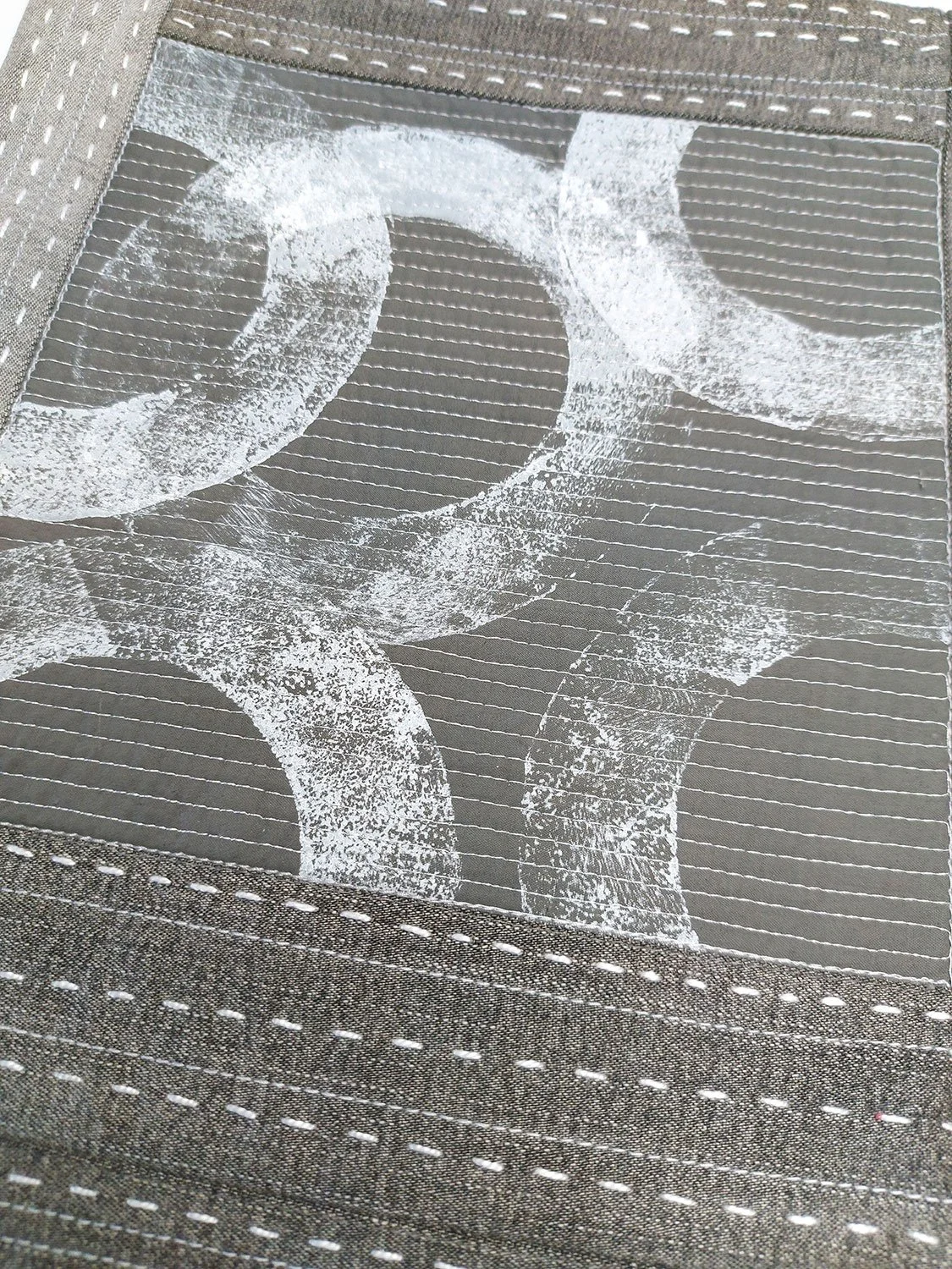 This piece was made to showcase a number of simple mark making techniques. It was put together with machine stitch, in an improv style, and then stitched by hand. I stitched through the top and wadding which made the whole process easier on my hands. The backing is part of a fine cotton sarong that I stitched into place separately. It might seem a long way to go about things, but I know that I wouldn’t have been able to complete this level of stitching if I attempted to get my needle through all three layers. I have worked this way before and it really didn’t take long for me to complete the random circular shapes.